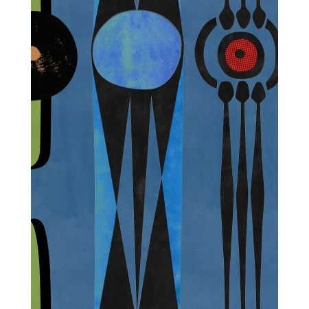 With a blocky, distressed look, offset geometrics combine on a handmade paper effect ground. Housing a combination of textures and collaged shapes, Snip Snip’s offset grid formation frames an array of mini, painterly artworks.