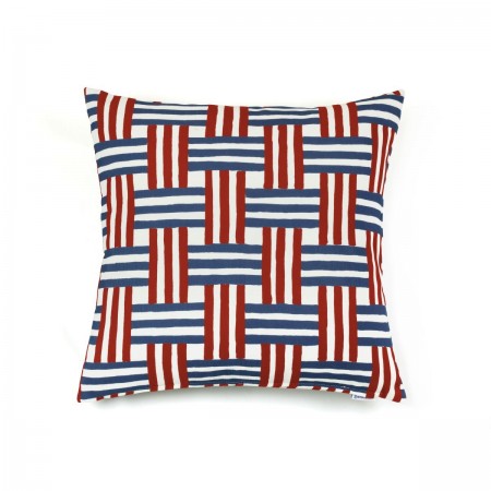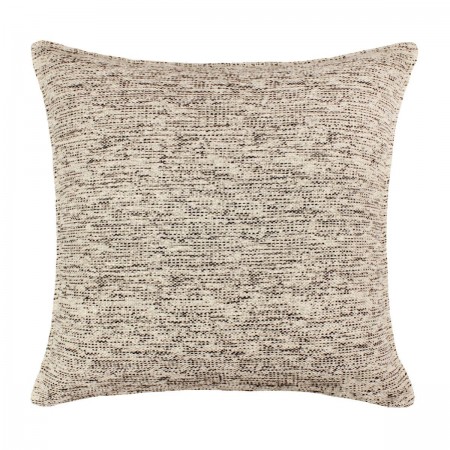 Cushion with natural background fabric featuring a zigzag design in chenille. The ten fine lines that create this flow are inspired by undulating furrows of sand. The colour palette – natural, terracotta, green, black and brown – follows organic trends