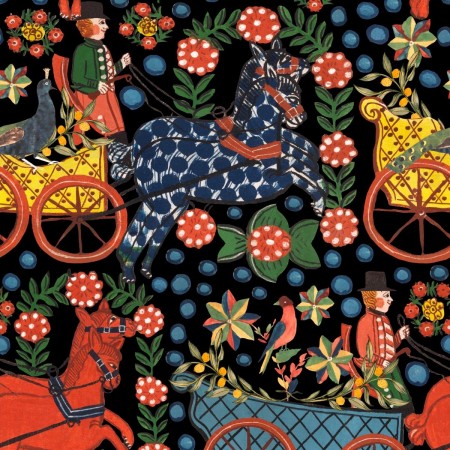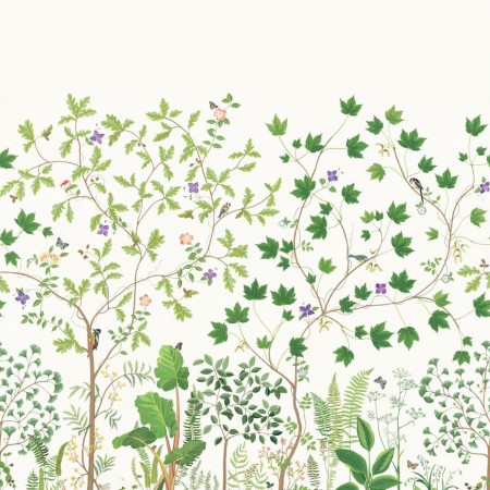 Flora features intricate trails of hand painted flowers, leaves, and berries. The design draws inspiration from iconic arts and craft textiles, with winding motifs that draw your eye across the composition. The loose nature of the hand painted elements gi
